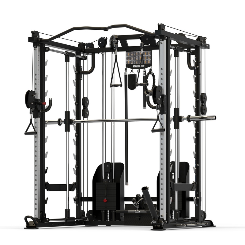 - Dotazioni 2-IN-1 dual pulley, 3D smith machine. Lat pulldown/ seated rowing/chin-up bar.