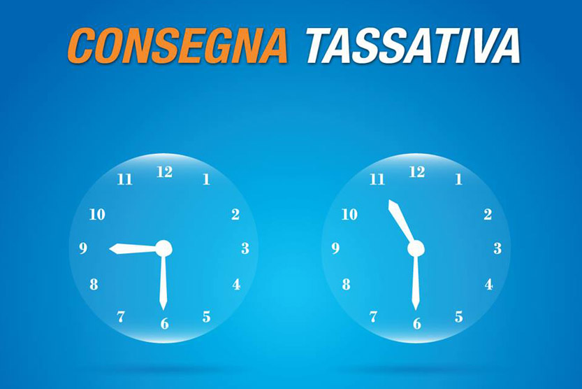 La consegna tassativa non riduce i normali tempi di spedizione ( v. prospetto a seguire*) ma da la possibilità al cliente di comunicare il giorno in cui desidera ricevere la merce.