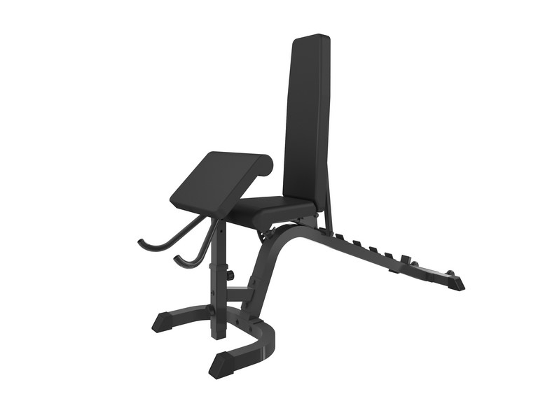 Panca multifunzionale, inclinata, piana e declinata, robusta, versatile e completa grazie al modulo leg extension* e leg curl compreso nella dotazione di serie ed integrabile, in opzione, con lat tower e con cuscino arm curl dotato di appoggi bilanciere.