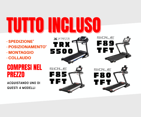 Scopri la promo “Tutto Incluso” Intergym: con l’acquisto di uno dei nostri tapis roulant top di gamma Sole Fitness (F89 TFT, F85 TFT o F80 TFT) ti garantiamo un’esperienza davvero senza pensieri. La nostra offerta comprende spedizione, posizionamento, montaggio e collaudo già inclusi nel prezzo. Il servizio è disponibile in tutta Italia* e pensato per permetterti di iniziare ad allenarti subito, senza stress e senza costi aggiuntivi. Scegli il tuo tapis roulant ideale: dal trasporto alla prima accensione, ci occupiamo noi di tutto. Con Intergym hai la tranquillità di un servizio completo, rapido e professionale.